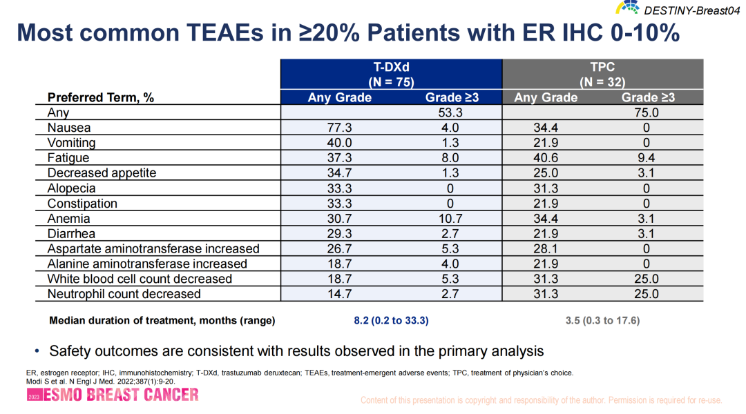 ER 0%和ER 1%~10%的患者安全性与既往报道一致,常见的治疗期间不良事件(TEAEs)仍是以消化道症状、骨髓抑制为主。T-DXd和TPC治疗患者的≥3级TEAEs发生率分别为53.3%和75%。