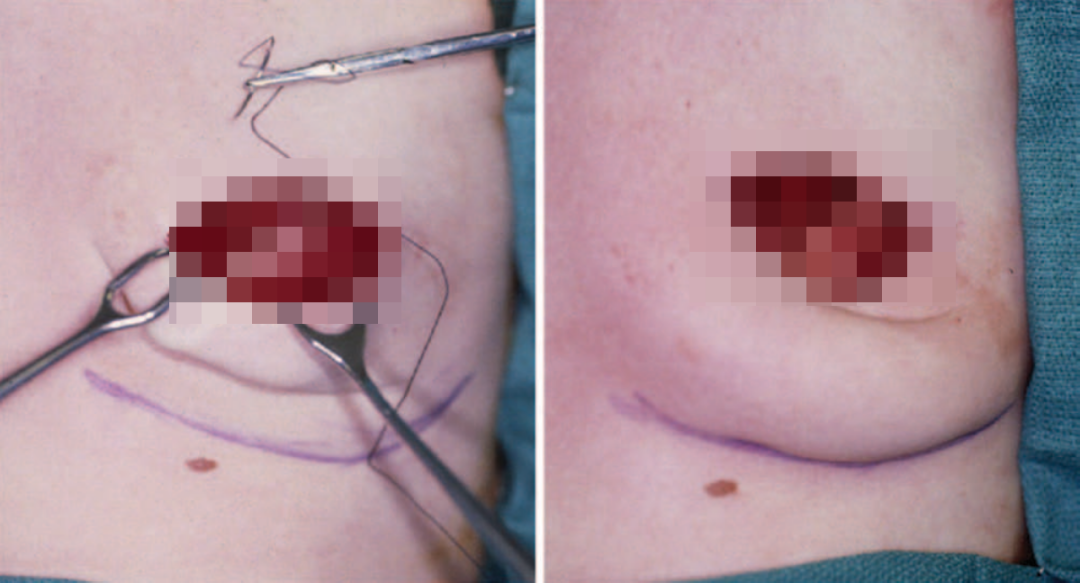 对于双侧乳房不对称的患者,要达到术后双侧对称的效果需要对下皱襞进行处理,这种重建措施就称为下皱襞重建。步骤包括:术前画线标记下皱襞位置,根据双侧情况决定以哪一侧为参考;术中若患侧高,需打开三角集束韧带,采用丝线进行下皱襞塑形,我们采用4号线在腔内进行“过”缝合,从体表看到像酒窝一样的缝合效果(见下图)。