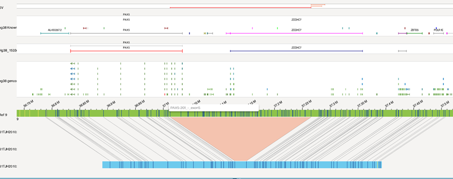 图1.PAX5-ZCCHC7融合基因(PAX5基因外显子5断裂)