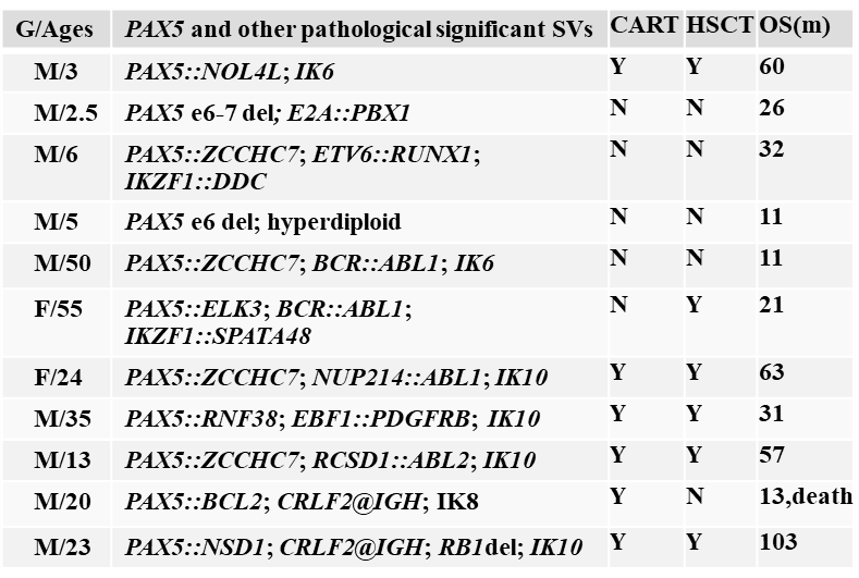 PAX5结构异常是B-ALL中常见且重要的遗传事件,其形式多样,包括框架内基因融合、3’缺失(PAX5::ZCCHC7)和外显子部分缺失(图1)。OGM联合RNA-seq有助于破译病理性PAX5结构异常。PAX5结构异常多发生在BCR::ABL1阳性和BCR::ABL1样患者中,且常与IK10相关。CART桥接同种异体造血干细胞移植治疗有助于改善这些患者的预后和生存率(表1)。