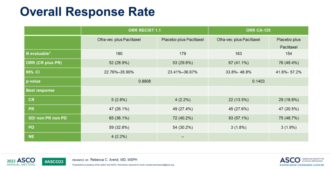 两组的客观缓解率(ORR)相似:VB-111组的基于RECIST 1.1标准评估的ORR为28.9%(95%CI: 22.76%-35.90%),对照组为29.6%(95%CI: 23.41%-36.67%)(p=0.8808)。CA-125 ORR分别为41.1% vs. 49.4%。