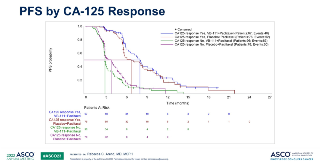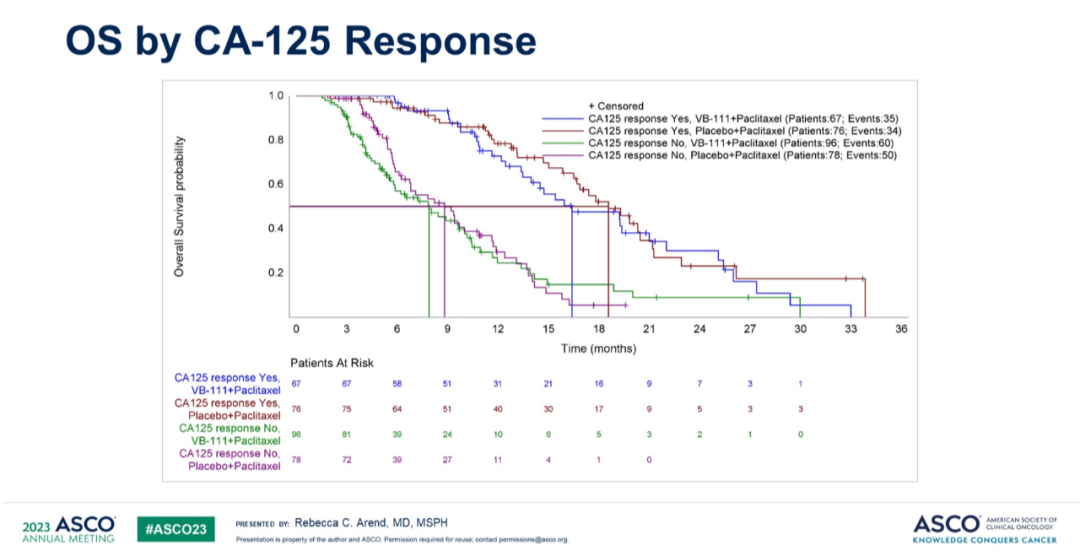 在两个治疗组中,CA-125缓解是PFS和OS的重要预后因素。在VB-111治疗组中,CA-125缓解者与无CA-125缓解者相比,PFS HR为0.2428(95%CI: 0.1642-0.3588),OS的HR为0.3343(95%CI: 0.2134-0.5238)。