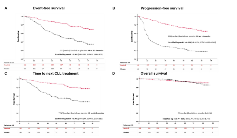 研究纳入进展风险高的无症状、未经治疗Binet A期CLL患者,以1:1的比例随机分为伊布替尼组(n=182)或安慰剂组(n=181),分别给予伊布替尼或安慰剂治疗,每日420 mg。最终分析评估了无事件生存期(EFS;定义为症状进展、CLL治疗或死亡的时间)、无进展生存期(PFS)、至下次治疗时间(TTNT)和总生存率(OS)。