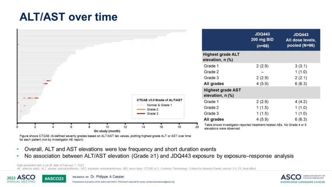 KontRASt-01研究是一项非盲、多中心、剂量递增(DEs)和剂量扩展(DEx)的Ib/II期临床试验,2023 ASCO发布了安全性和有效性分析数据。在Des、DEx和食物影响(Food effect, FE)队列中, 按照200mg QD、400mg QD、200mg BID、300mg BID剂量方案进行JDQ443单药治疗。首先,JDQ443看起来耐受性较好——例如主要副作用没有肝炎,我们知道肝毒性确实阻碍了sotorasib的研究步伐,尤其是尝试将sotorasib与PD-1/PD-L1抑制剂进行联合前移到KRAS G12C突变NSCLC一线治疗时(CodeBreak100/101研究)。而在KontRASt-01试验中,JDQ443所致的3级ALT和AST升高的发生率均低于3%。