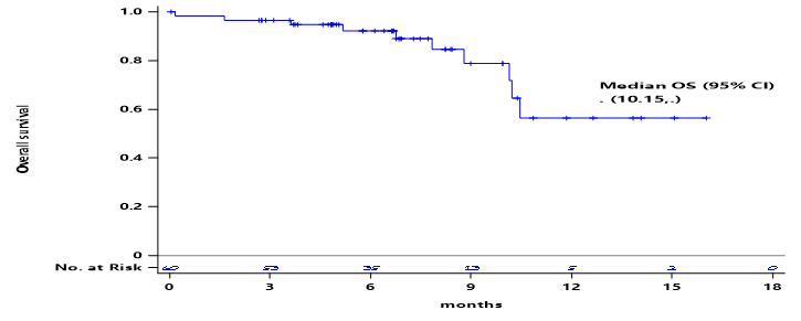 52例患者接受了至少一周期的度伐利尤单抗联合奥拉帕利维持治疗。APF12(1年PFS率)为18%,中位PFS为5.82个月(图1)。ORR和疾病控制率(DCR)分别为73.4%和81.7%,中位DoR为5.36个月。中位OS尚未达到(图2)。