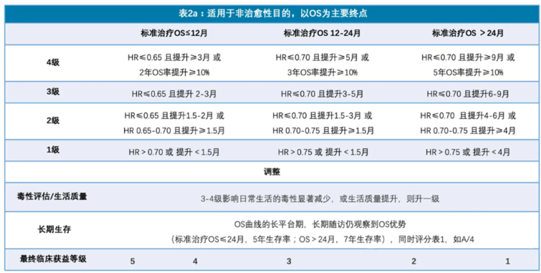 与其他指南共识不同,ESMO指南在保留证据等级和推荐级别的基础上进一步推出了ESMO开发的临床获益程度评分量表(Magnitude of Clinical Benefit Scale,MCBS)[3]作为临床治疗决策的重要参考,尤其是在治疗标准不确定、缺乏头对头证据的情况下,ESMO-MCBS评分提供了一种以临床价值为导向,衡量不同治疗选择的临床获益的结构化工具。针对非治愈性为目的的临床研究,依据PFS及OS等数据将疗效评分初步分1-4分,分数越高疗效越好,并依据毒性评估和生活质量获益对评分进行调整,最高为5分(详情见图1)。