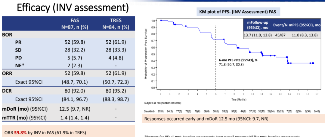 独立审查委员会(IRC)评估的客观缓解率(ORR)、疾病控制率(DCR)分别为58.6%与92.0%,中位至缓解时间(TTR)为1.4个月,中位无进展生存(PFS)为13.8个月,6个月PFS率分别为76.4%,中位缓解持续时间(DoR)与总生存(OS)尚未达到。研究者(INV)评估的患者ORR为59.8%,DCR为92.0%,中位TTR与DoR分别为1.4个月与12.5个月。患者的中位PFS达11.0个月,6个月PFS率为71.8%。