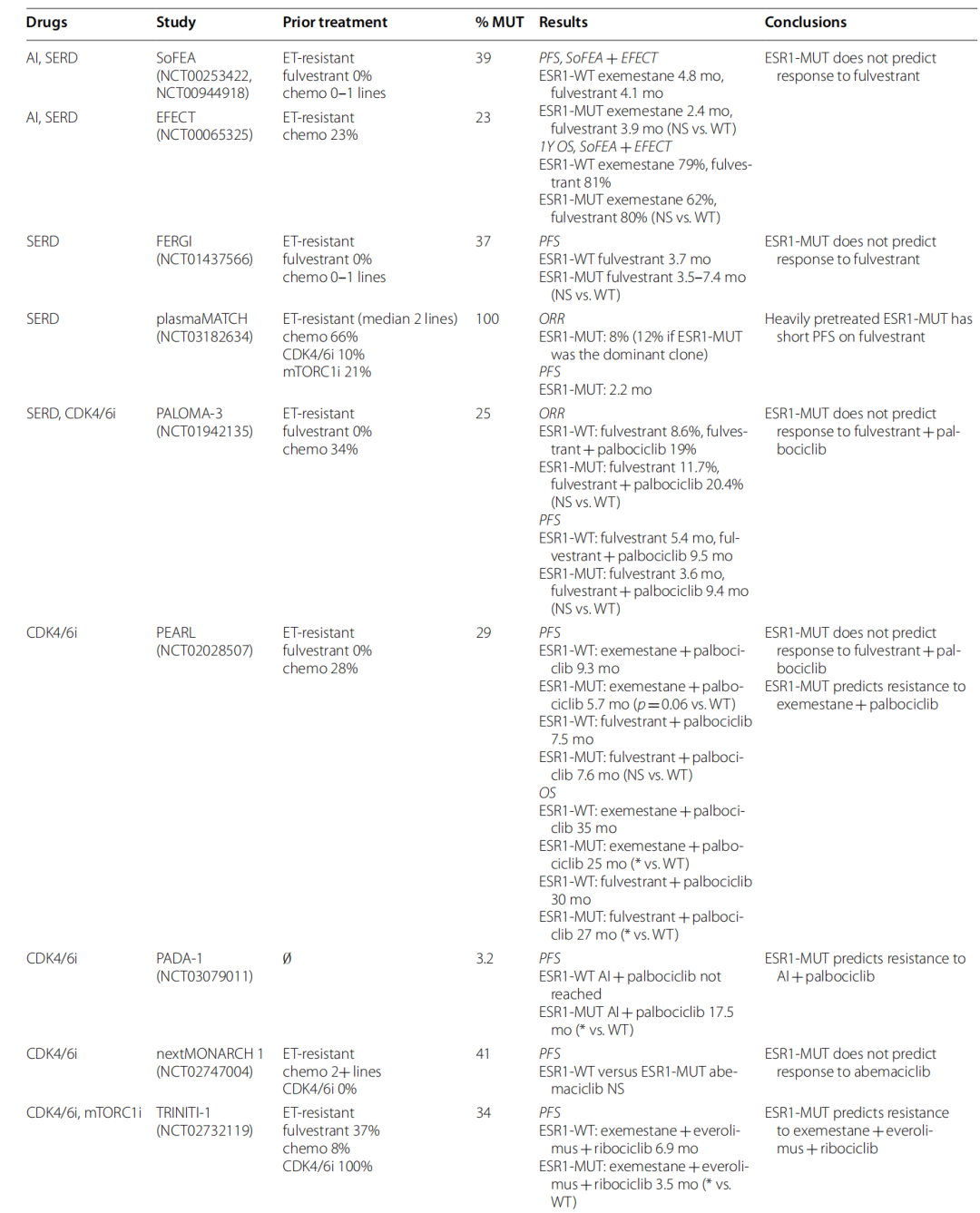 表1.分析基线ESR1突变如何影响临床结果的研究