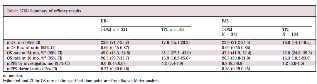 在HR+患者中,T-DXd vs TPC的中位OS为23.9个月vs 17.6个月(HR=0.69),2年OS率为49.0%vs 35.1%;3年OS率为26.5%vs 16.9%;研究者评估的中位PFS为9.6个月vs 4.2个月(HR=0.37);在FAS患者中,T-DXd vs TPC的中位OS为22.9个月vs 16.8个月(HR=0.69),2年OS率为47.3%vs 32.0%;3年OS率为26.2%vs 16.3%;研究者评估的中位PFS为8.8个月vs 4.2个月(HR=0.36)。