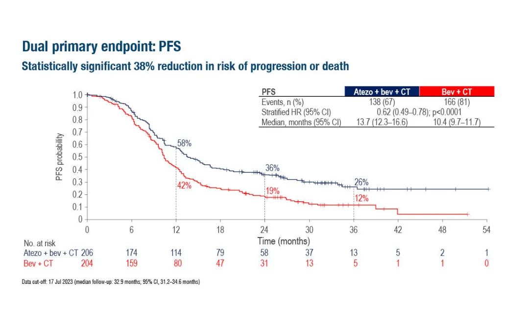 贝伐珠单抗和化疗加用阿替利珠单抗显著改善了无进展生存期(摘要号VP5-2023)