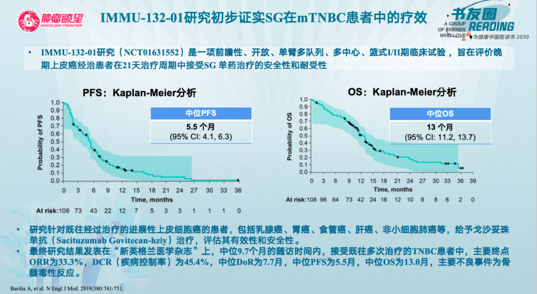 IMMU-132-01研究初步证实了SG在mTNBC患者中的疗效:中位9.7个月的随访时间内,接受既往多次治疗的TNBC患者中,主要终点ORR为33.3%,明显优于目前TNBC的二线可选药物方案的疗效,DCR(疾病控制率)为45.4%,中位DoR为7.7月,中位PFS为5.5月,中位OS为13.0月,主要不良事件为骨髓毒性反应。