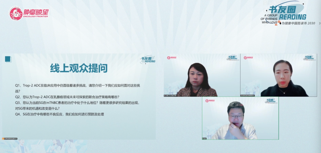 2023年11月28日19:30,复旦大学附属肿瘤医院张剑教授(主持)与浙江大学医学院附属邵逸夫医院陆海琦教授(讲者)、兰州大学第一医院令晓玲教授(讲者)共同做客《书友圈》,就Trop-2 ADC在mTNBC中的进展及年度回顾进行了介绍。