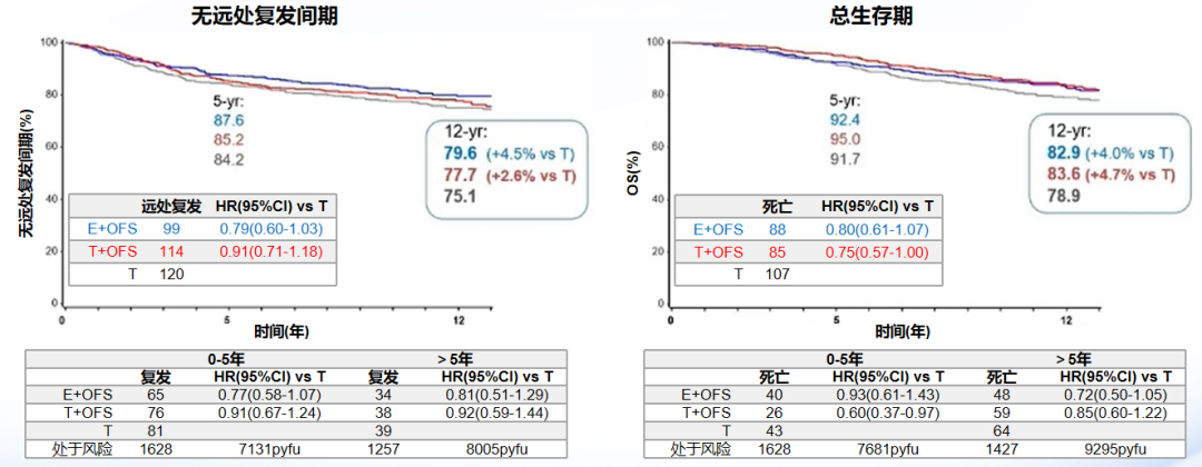 SOFT研究延长随访至12年的数据进一步显示,既往化疗队列的获益更多,OFS+TAM组远处复发率绝对值降低2.6%,死亡率12年绝对值降低4.7%。再次验证了化疗人群接受OFS强化治疗的持续获益[13]
