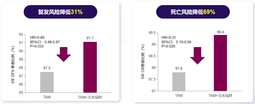 ASTRRA是一项开放标签、前瞻性、随机化、多中心、3期研究。该研究纳入了1293例绝经前、雌激素受体阳性的早期乳腺癌患者,按1:1的比例分别接受他莫昔芬和戈舍瑞林的联合治疗,或他莫昔芬单药治疗,5年随访数据[14]显示:相比TAM单药,OFS(戈舍瑞林)+TAM分别降低绝经前HR+乳腺癌化疗患者31%的疾病复发风险和69%的死亡风险。