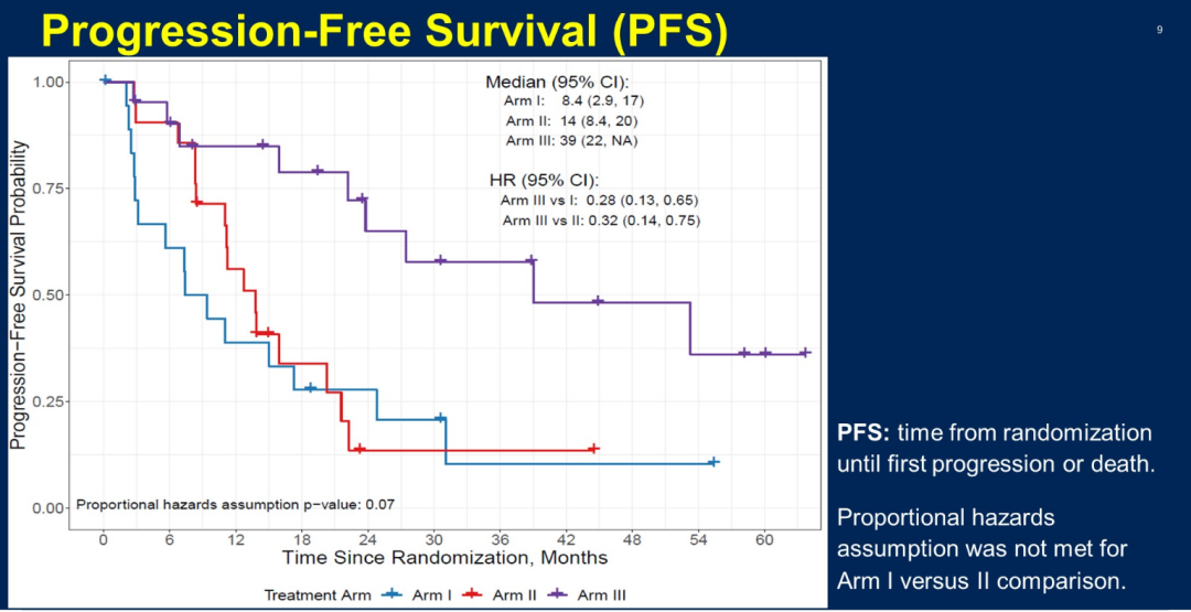 关于PARP抑制剂联合新型内分泌治疗用于mCRPC治疗,本次ASCO-GU也有不少相关研究报道,拓展了mCRPC患者一线治疗选择。PROfound、PROpel研究分别证实了奥拉帕利在mCRPC二线治疗和一线治疗的获益。因此,大会聚焦的一个问题是,奥拉帕利到底应该用在一线还是二线治疗?本次大会报道的BRCAAway研究尝试去回答这个问题。该研究入组携带HRR突变的mCRPC一线治疗患者,队列1-3是携带BRCA1/2或ATM突变患者,分别接受阿比特龙单药、奥拉帕利单药和奥拉帕利+阿比特龙联合治疗。结果显示这三组患者均有获益趋势,但奥拉帕利+阿比特龙的获益是最明显的,中位PFS达到了39个月,而阿比特龙单药和奥拉帕利单药的中位PFS分别为8.5个月和14个月。