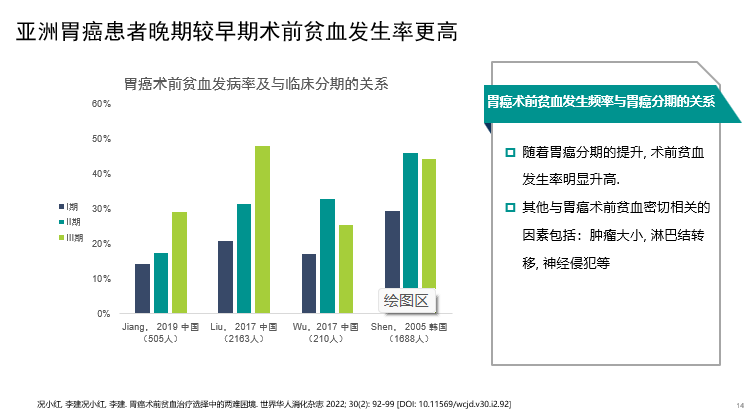 胃癌患者接受化疗的周期越多、分期越晚,CIA的发生率和严重性就越大。一项研究显示,随着化疗周期的开展,中/重度贫血发生率快速升高,到第6周期时,中重度贫血发生率可达70%以上[4]。多项亚洲临床研究先后证实,胃癌患者分期越晚,术前贫血发生率越高,且肿瘤大小、淋巴结转移等都与术前贫血有密不可分的关系[7]。