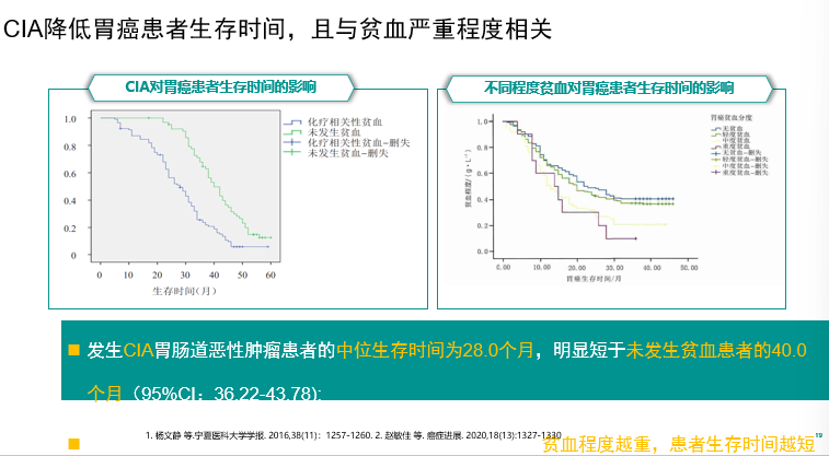 CIA在影响胃癌患者RDI的基础上,会进一步影响胃癌患者的生存时间。我国临床研究显示,对于胃肠道恶性肿瘤患者,发生CIA人群的mOS为28.0个月,未发生CIA则为40.0个月,而且呈现贫血程度越严重,患者mOS越短的特点[13,14]。