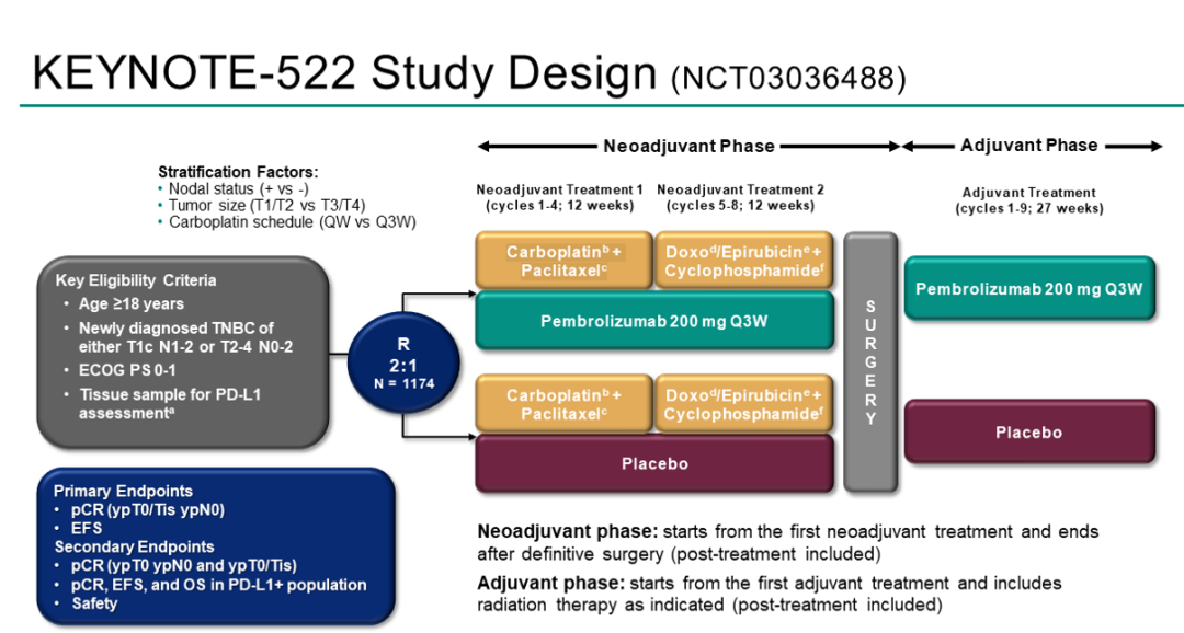 基于关键研究KEYNOTE-522的结果,新辅助化疗联合PD-1抑制剂pembrolizumab是目前高危Ⅱ期和Ⅲ期三阴性乳腺癌(TNBC)女性的标准治疗方案。该研究表明,在大约5年的中位随访后,pembrolizumab的加入导致无事件生存率(EFS)9%的临床意义的绝对改善。