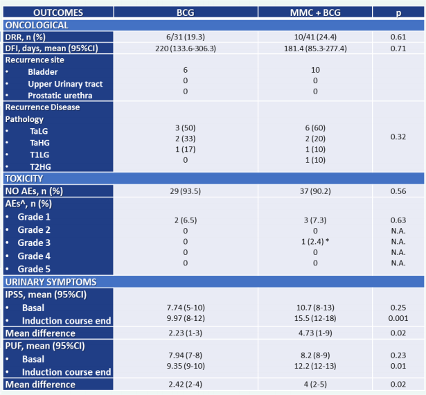本次EAU大会报道了一项多中心随机对照研究(摘要号:A0736),纳入了72例高危NMIBC患者,随机分为单独BCG灌注组(81 mg,每周一次,共6周诱导灌注;第3、6、12个维持灌注)和丝裂霉素C序贯BCG灌注组(BCG灌注前一天,4 mg)。遗憾的是该研究没有达到主要终点,单独BCG组和序贯组的复发率分别为6/31(19%)和10/41(24%)(P=0.611);次要终点无病间期(DFI)也没有改善(HR 1.23,P=0.640),且序贯组患者的不良反应发生率更高。尽管该研究并未获得阳性结果,但也为我们今后的临床探索提供了一些经验和启示,未来我们仍需对高危NMIBC患者的膀胱灌注方案进行深入探索,以期为患者带来更好的治疗结局。