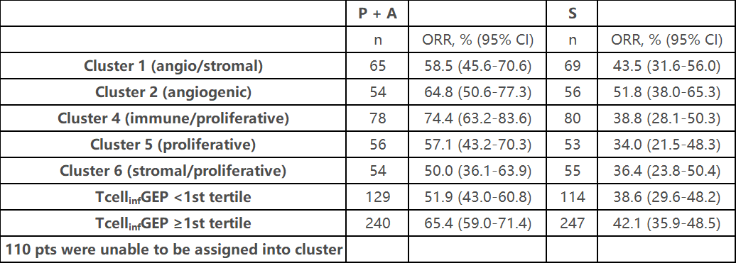 在861名患者中,联合治疗组和舒尼替尼组有RNAseq存档样本的患者分别有369名和361名,有WES样本的分别有347名和351名。对于舒尼替尼组,PD-L1 CPS与OS呈负相关(P=0.013)。对于帕博利珠单抗联合阿昔替尼组,TcellinfGEP与OS(P=0.003)、PFS(P<0.0001)和ORR(P<0.0001)呈显著正相关,而血管生成与OS呈正相关(P=0.013)。对于舒尼替尼组,血管生成与OS(P<0.0001)、PFS(P<0.001)和ORR(P=0.002)呈正相关。对于其他RNA特征,发现联合治疗组的mMDSC与PFS(P=0.018)和ORR(P=0.093)呈正相关。对于舒尼替尼组,发现缺氧与OS(P=0.034)和ORR(P=0.071)呈正相关,MYC与OS(P<0.001)和PFS(P=0.012)呈负相关,增殖也与OS呈负相关(P=0.002)。在所有分子簇中,联合治疗组的ORR优于舒尼替尼组,其中免疫/增殖簇的ORR最高。通过WES分析,联合治疗组的PBRM1突变与ORR(P=0.004)和PFS(P=0.079)呈正相关。对于舒尼替尼组,VHL(P=0.073)和PBRM1(P=0.001)与OS呈正相关,BAP1突变(P=0.046)与OS呈负相关。无论突变状态如何,联合治疗组的ORR改善均优于舒尼替尼组。