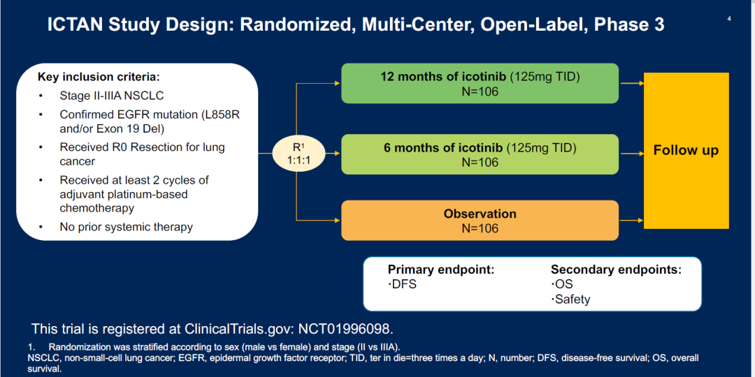 对话伊始,作为ICTAN研究的PI,王思愚教授首先对该研究进行了整体回顾。ICTAN研究是一项随机、多中心、III期临床研究,主要纳入EGFR敏感突变(L858R和/或19外显子缺失)阳性的II-IIIA期NSCLC患者。所有患者均接受过根治性切除术,并接受2~4周期含铂辅助化疗,其中约80%的患者接受了4周期辅助化疗。此后按1:1:1随机分为三组,分别序贯埃克替尼12个月、6个月,或单纯观察。主要终点是意向治疗人群(ITT)的无病生存期(DFS),次要终点是总生存期(OS)和安全性。