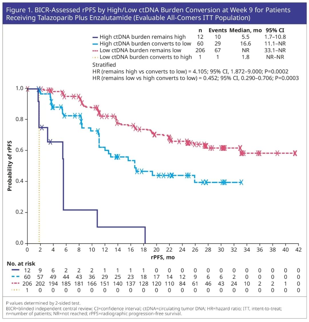 基线时高ctDNA负荷预示着rPFS的不良预后,在第9周时ctDNA从高到低转变预示患者的rPFS改善。这些结果支持ctDNA负荷在使用恩扎卢胺联合/不联合他拉唑帕利的mCRPC患者中进行广泛的预后应用探索。