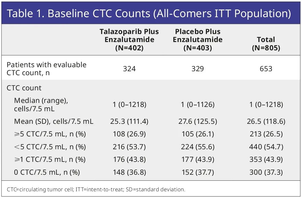 TALAPRO-2(NCT03395197)显示,与接受PBO+ENZA的mCRPC全人群患者相比,接受TALA+ENZA的患者的rPFS显著改善。既往5项mCRPC的III期研究中,循环肿瘤细胞(CTC)在第13周时从≥5每7.5 ml血液降低至<5每7.5ml血液或者从≥1降至0(CTC0)是总生存预后的因素,且较PSA降低具有更高的识别力。研究检验CTC变化和CTC0是否可作为TALAPRO-2的rPFS预后标志物。
