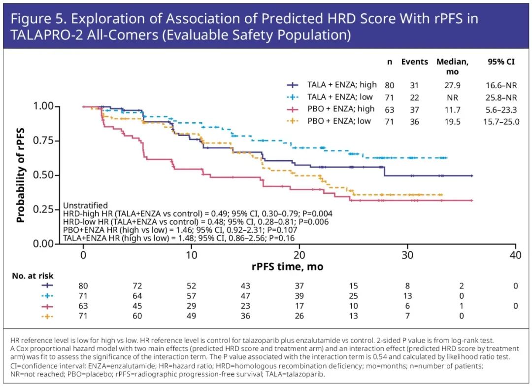各治疗组中,HRD-评分高较HRD-评分低的患者rPFS更短,但无统计学差异。接受TALA+ENZA治疗的患者,HRD-高评分(HR=0.49,P=0.004)和HRD-低评分(HR=0.48,P=0.006)的患者均显示出比PBO+ENZA更好的rPFS。