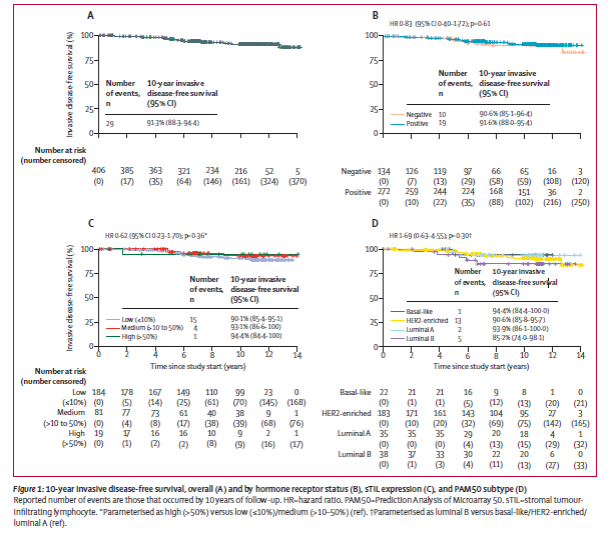 10年IDFS生存率为91.3%(95%CI 88.3-94.4;图2A)。根据激素受体状态、sTIL表达(事后)和PAM50亚型(事后)分层的10年无浸润性疾病生存率如图2B-D所示。